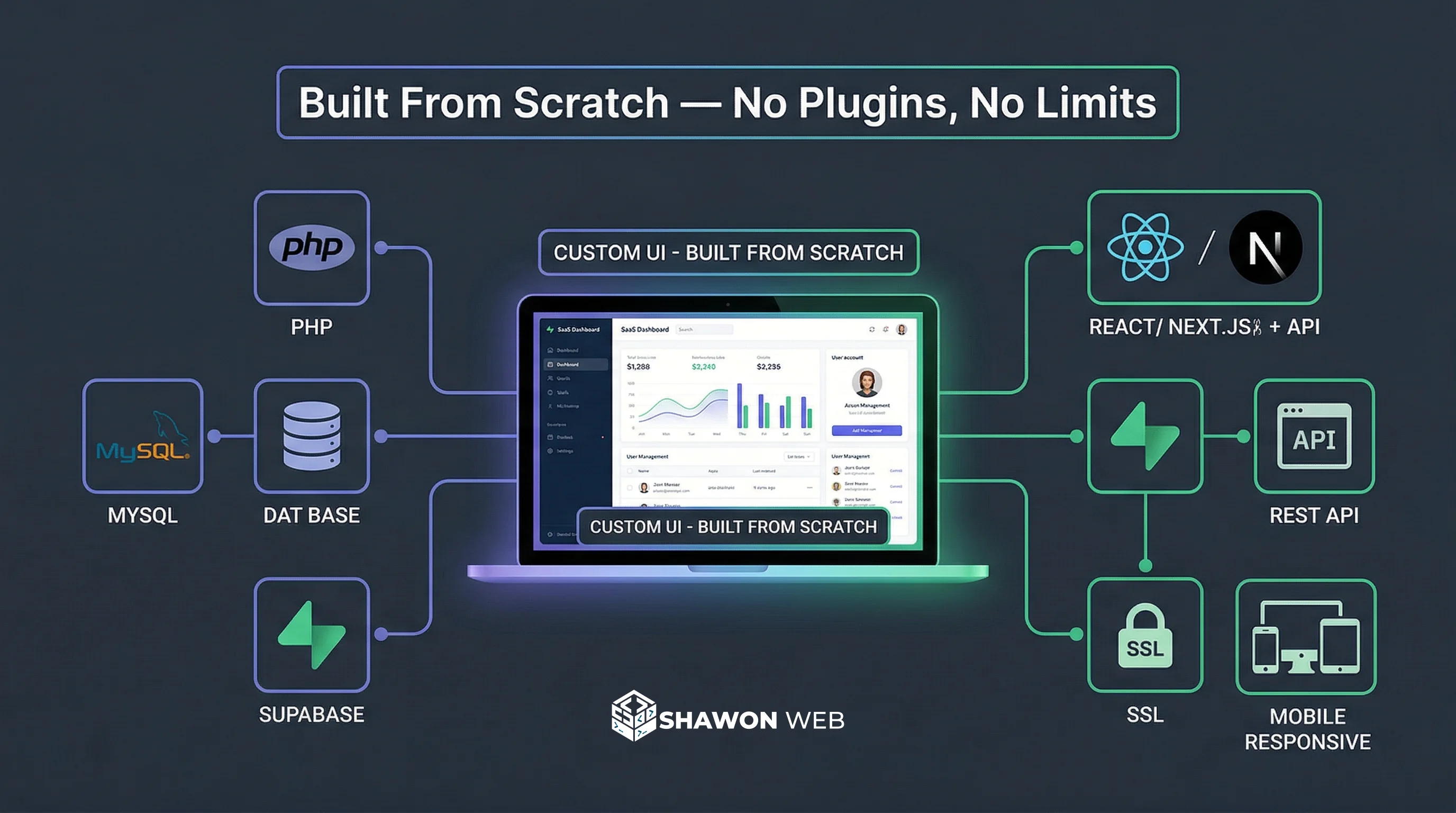 Every component of your website is engineered from scratch. No pre-made themes, no page builders, no plugin dependencies.