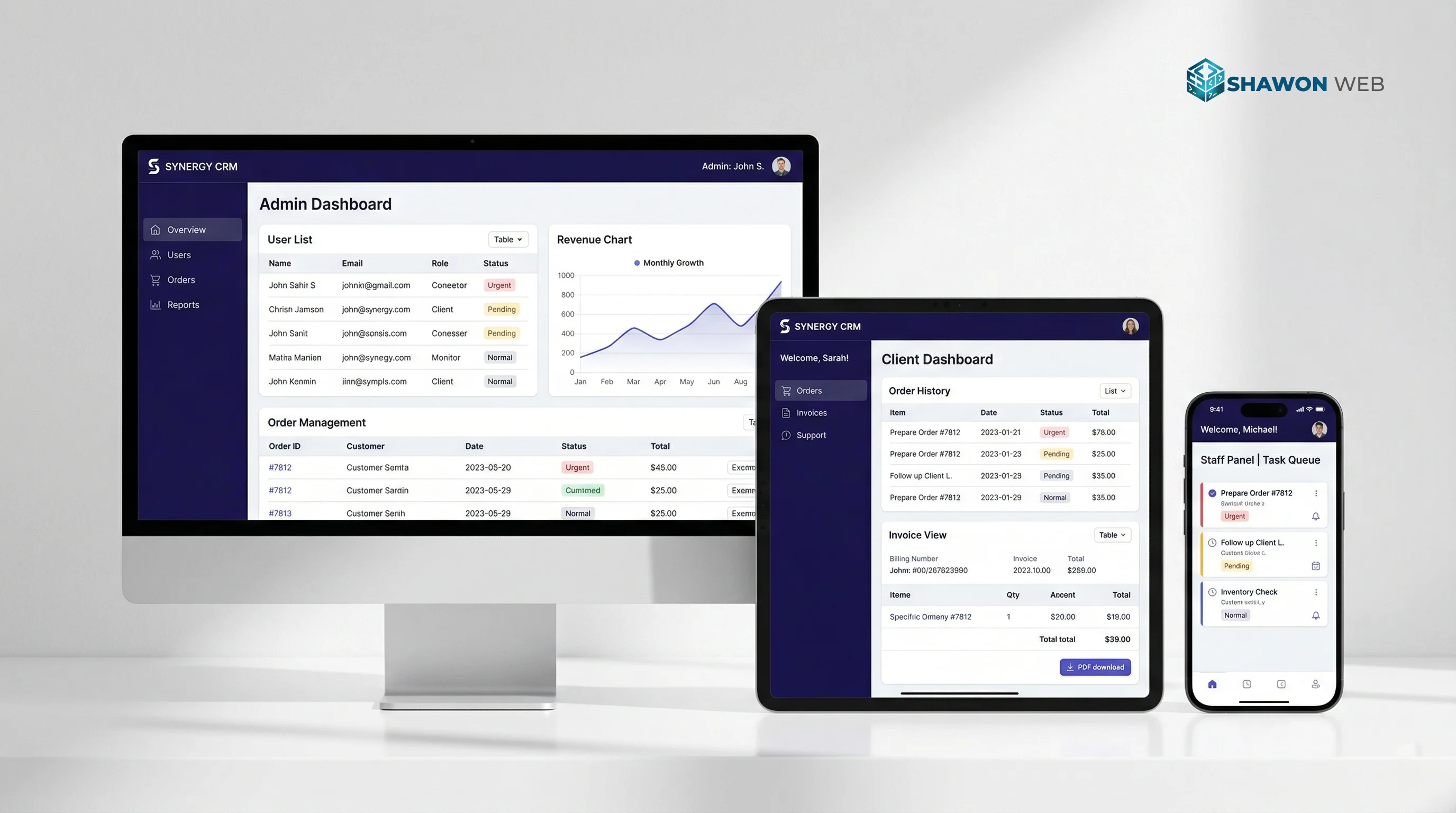 Role-based user accounts — clients, admins, staff — each with their own dashboard view, permissions, and access to the right data only.